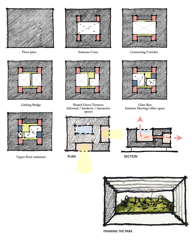 Layering occurs within the interior of a simple form. The park is pulled into the ground floor of the building, and within this monolithic translu- cent enclosure occurs different layers, levels, green- ery, and functions. The simple rectangular form that makes up the building is interrupted at three points; the park within the interior, the food court area, and the pool on the roof. These interruptions are like cracks that diversify the experience of the space. Each cutout and interruption in the form is a window into part of the context, it can either be the bay, the park, or the sky.